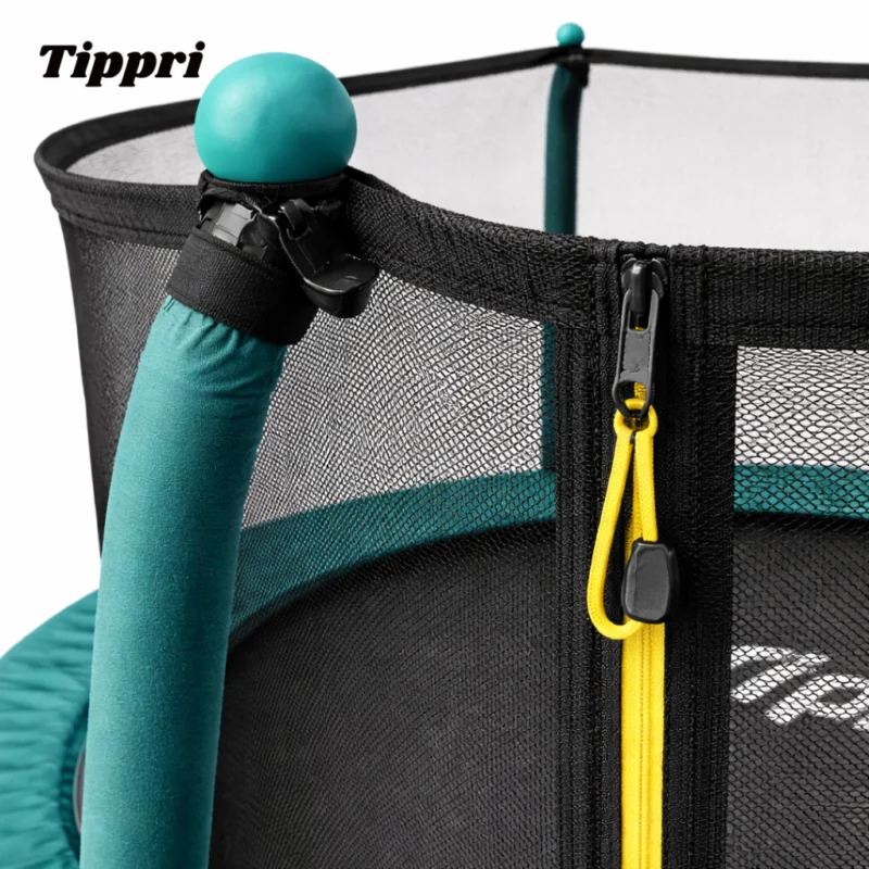 This is a standard family-sized outdoor trampoline designed for backyard use. It features a secure, no-gap safety enclosure to keep jumpers safely on the mat. The design is characterized by its heavy-duty steel frame and the distinctive Teal/Blue spring pad combined with a high-visibility yellow zipper on the black enclosure net.