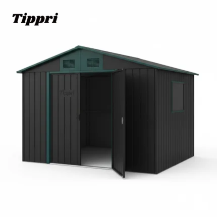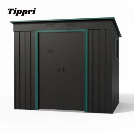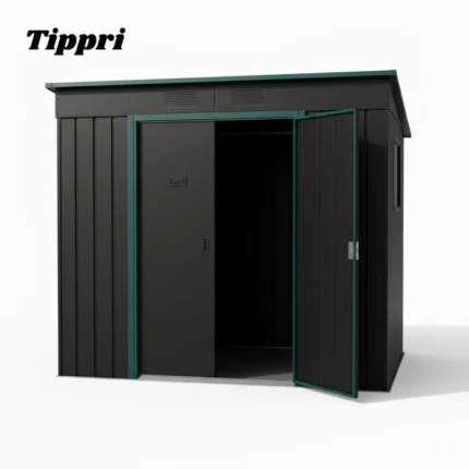 The Tippri Metal Outdoor Storage Shed is a versatile and durable prefabricated unit designed for residential backyard and garden storage. It features a modern two-tone design, typically a dark body color (like black or dark grey) with contrasting trim (like green or white) on the doors and roof edges. Constructed from galvanized steel, it offers a weather-resistant solution for organizing tools, equipment, and outdoor gear, combining a functional storage area with a contemporary aesthetic.