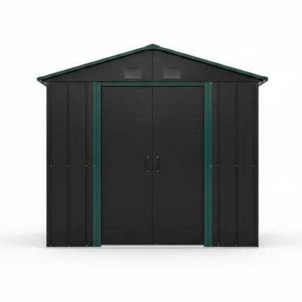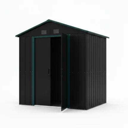 This Tippri storage shed is a premium, low-maintenance solution for outdoor organization. Constructed from durable, galvanized steel, it provides a rust-resistant and weatherproof space for all your tools and equipment. The striking two-tone design, featuring a modern black body with contrasting mint green accents, allows it to serve as both a functional utility structure and a contemporary garden feature.