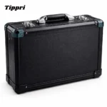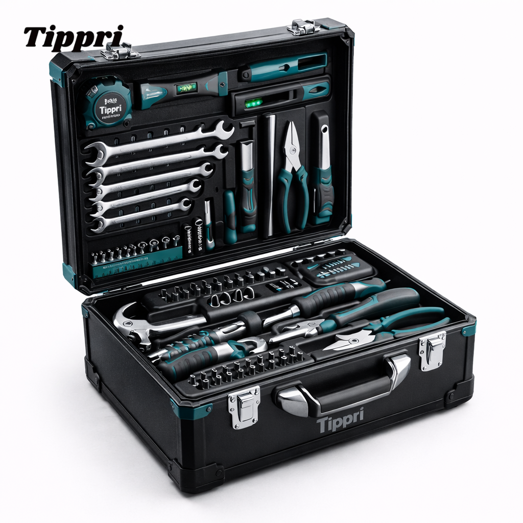 The Tippri 187-Piece Tool Set is built into a heavy-duty, lockable aluminum trolley case, featuring a telescoping handle and smooth-rolling wheels for effortless portability. The interior is structured with four removable, organized trays that keep the 187 pieces securely in place using custom-molded slots, typically color-accented in black/teal. The collection includes a mix of metric and SAE sockets, various wrenches, screwdrivers, pliers, a hammer, a level, and other general-purpose items. This organizational system ensures tools are easy to find, use, and put back, preventing loss and clutter in a workshop, garage, or vehicle.
