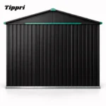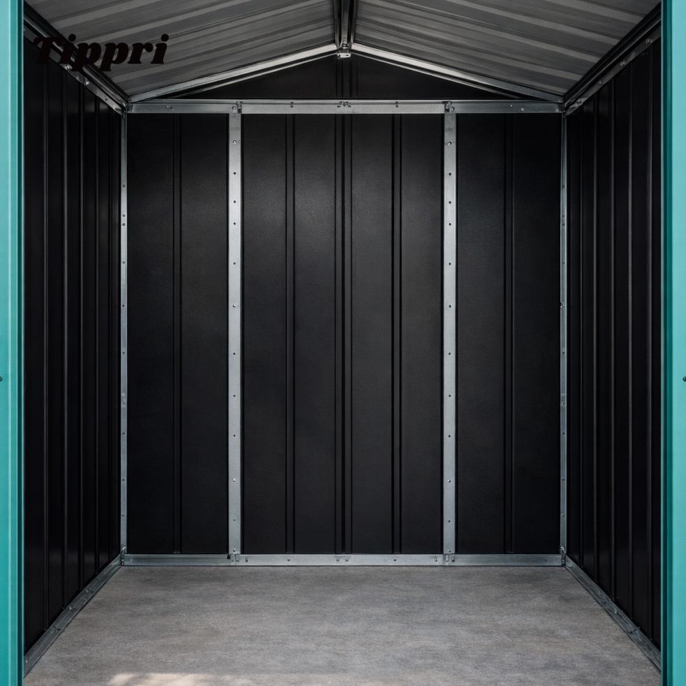 This is a premium, heavy-gauge corrugated metal shed kit featuring a two-tone aesthetic with a charcoal black body and a bright teal trim and doors. The structure utilizes a traditional gable roof design for efficient water and snow runoff, preventing accumulation and protecting stored items from moisture damage. The main storage compartment provides ample space for large items and features double sliding/swing doors for easy access. Critically, the shed includes a dedicated, open-air log storage extension (firewood rack) on the side, allowing wood to be seasoned and kept dry while providing easy access without entering the main shed. Built-in ventilation ensures proper air circulation to prevent mold and mildew inside the storage area.
