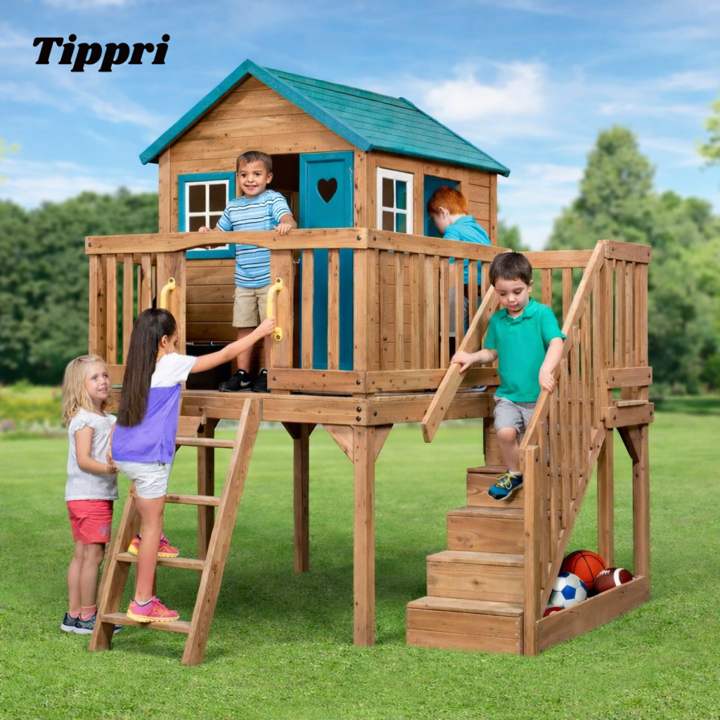 Elevated Design: The playhouse is set on sturdy stilts/legs, providing a raised clubhouse for imaginative play and utilizing the space underneath.