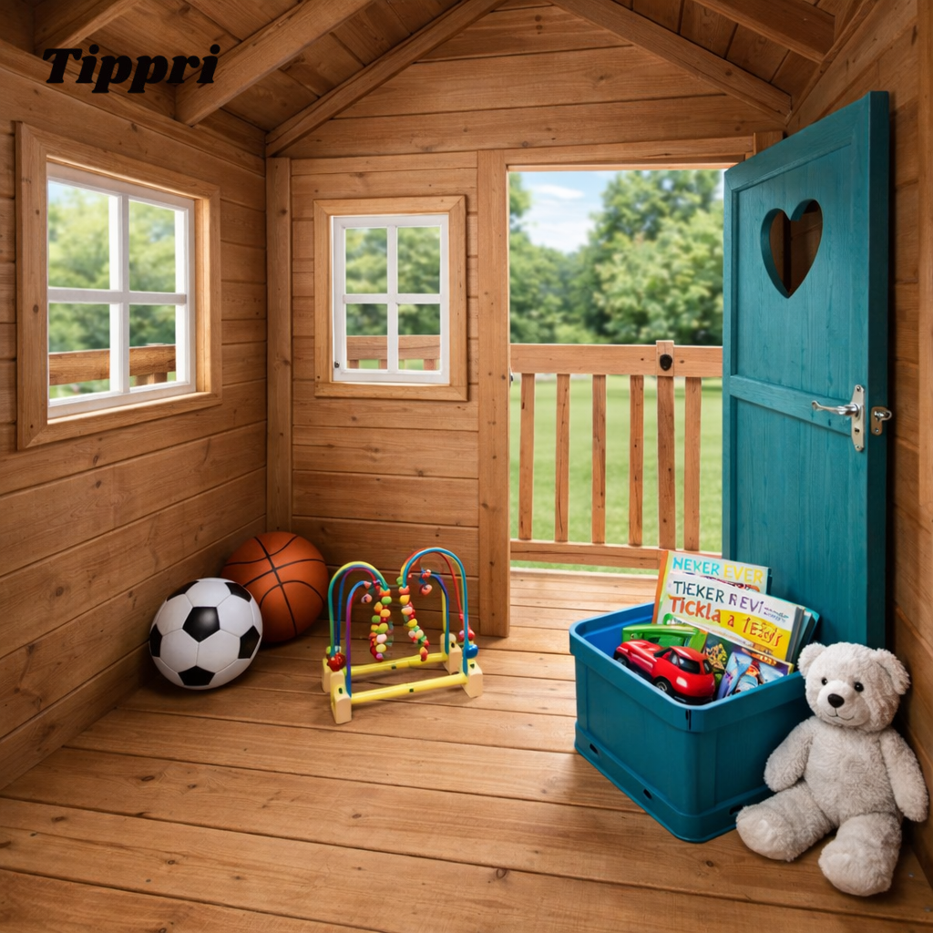 Blue Weather-Resistant Roof: A brightly colored, sloped roof helps to channel rain and provides shade inside the playhouse.